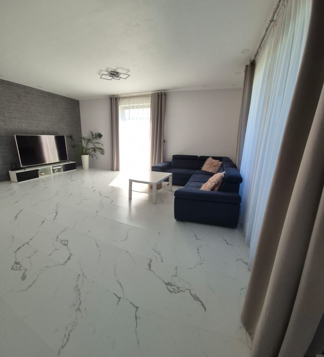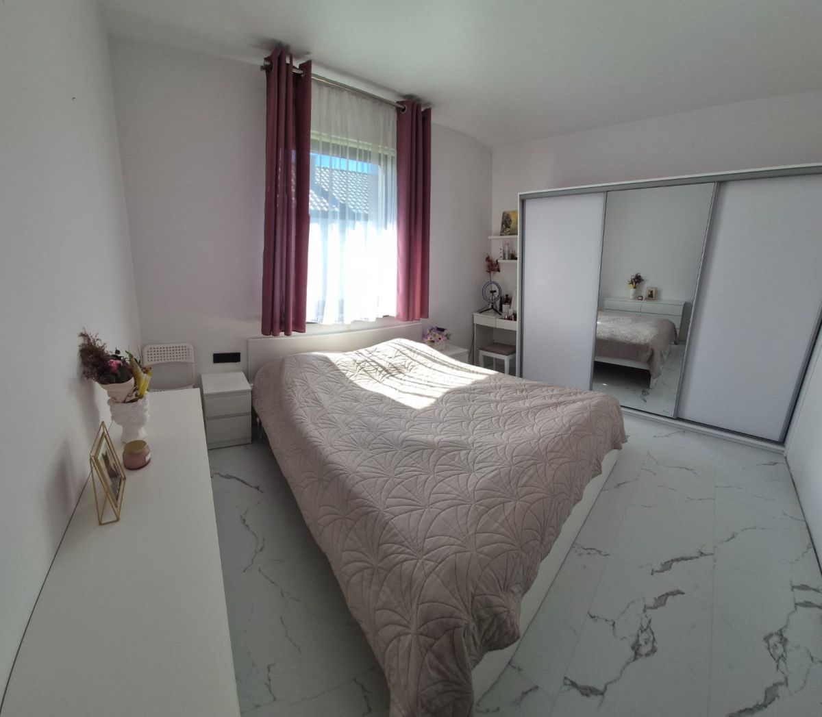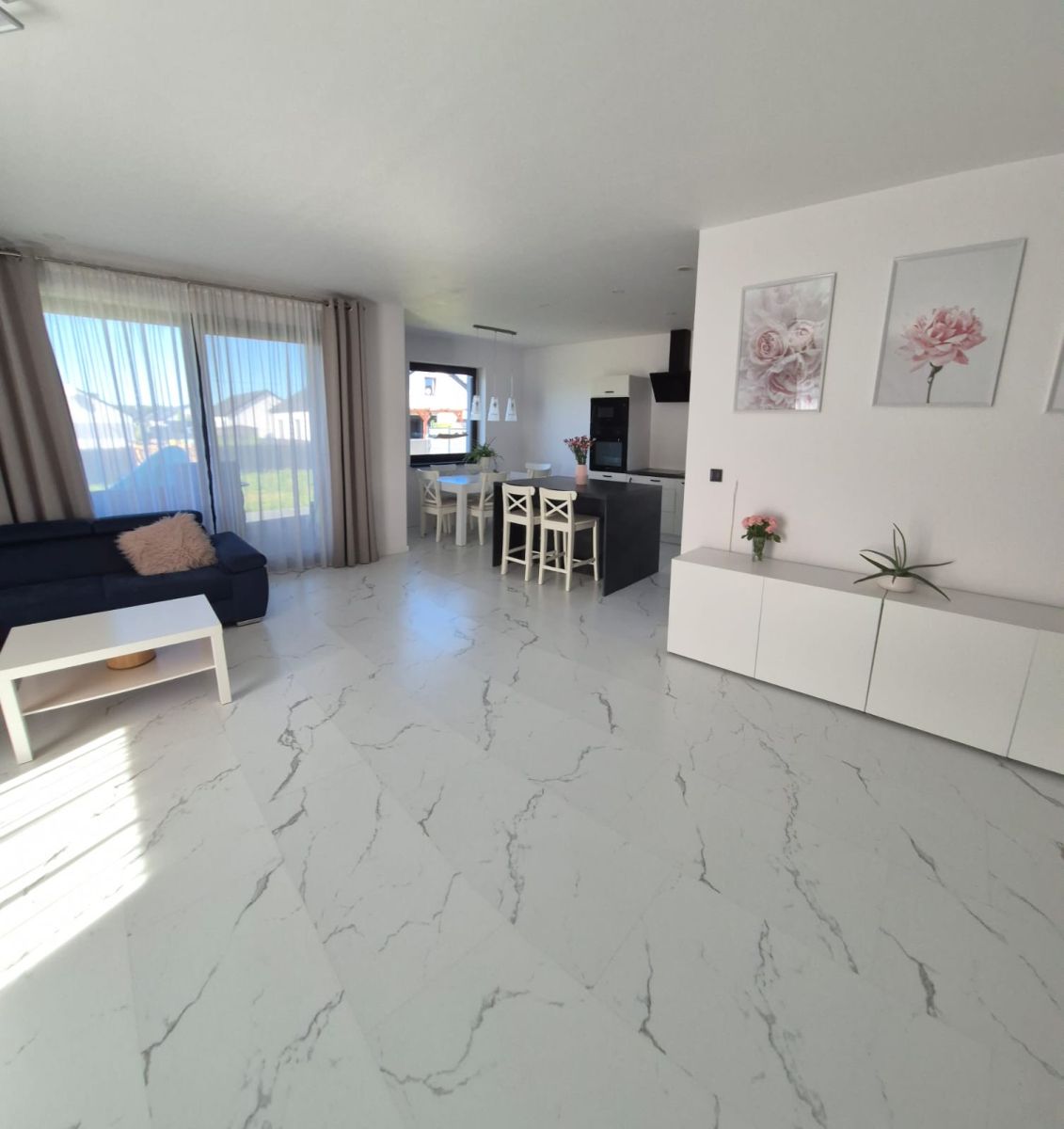 525m². W domu znajduje się salon, kuchnia z jadalnią, łazienka, trzy sypialnie, pomieszczenie gospodarcze.